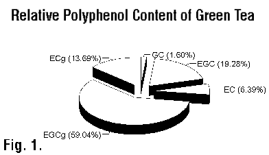The key fraction of the tea leaf (Camellia sinensis) that provides all these healthbenefits is a group of phytochemicals known as polyphenols. Long known as tea tanninbecause of their pungent taste, polyphenols constitute 15 to 30% of unfermented driedgreen tea and most of the soluble portion of tea. Thus, when you drink a cup of green tea,you're basically drinking a solution of tea polyphenols. In fresh, unfermented tea leaves,polyphenols exist as a series of chemicals called catechins, which include gallocatechin(GC), epigallocatechin (EGC), epicatechin (EC), epigallocatechin gallate (EGCg), andepicatechin gallate (ECg). As you can see in Figure 1, the largest component of fresh tealeaves is EGCg, which is fortunate, because it is also the most potent.Our focus so farhas been on green tea, but we Westerners are most familiar with black tea, which hassignificantly fewer polyphenols, and thus appears to be generally less beneficial. Bothblack and green tea come from the same source, but the leaves that eventually become blacktea are first broken up and exposed to air. This process promotes oxidation anddeactivation of the valuable polyphenols. Green tea, on the other hand, is processed in away that protects polyphenols by destroying the enzyme that oxidizes them. Consequently,green tea may contain as much as 90% more polyphenols than black tea. Before you run downto your local market to pick up some green tea, consider first that the amount ofprotection you get from green tea is directly proportional to how much of it you drink2(Fig.2).