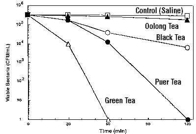 No less startling is the effect of green tea extract on viral infections. Japaneseresearchers have now demonstrated that EGCg and other tea polyphenols prevent theinfluenza virus from attaching itself to normal cells, thus blocking its infectivity. Evena small amount of EGCg seems to be capable of placing a significant obstacle in the way ofthe flu virus.27 Evidence also suggests activity against infections caused byrotavirus and enterovirus, which are common causes of diarrhea.28 Perhaps thebest-documented antimicrobial effect of tea catechins is against the bacteria that causetooth decay, Streptococcus mutans. In fact, green tea is probably better thanfluoride for keeping teeth healthy.29 In one study, green tea was found to befar more effective than other forms of tea against S mutans (See Fig. 4). Anotherrecent study found that EGCg completely inhibited the growth and cellular adherence ofanother important oral bacteria, Porphyromonas gingivalis.30 It has even beensuggested that green tea be used as prophylactic treatment in root canal because of itsbroad spectrum of antibacterial and bactericidal activity.31