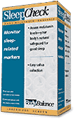 SleepCheck assesses Melatonin levels--your body's natural safeguard for healthy sleep. SleepCheck is a safe, easy-to-use, and reliable screen that uses a saliva sample to measure the level of melatonin in your body. This noninvasive and inexpensive screen provides the accuracy of a laboratory analysis without you having to leave the comfort of your own home. A good night's sleep helps keep your body in rhythm, allowing you to feel your best. Without it, your body doesn't function as well as effectively. Ever have times when you're not sleeping well? Maybe it's caused by stress, shift work, a general lack of time. All you know is that you are not sleeping very well and in turn, you're not thinking as clearly and sharply as you did before. Physically, you're drained, unmotivated to do anything other than getting through the day. A hormone called melatonin may affect your sleep. SleepCheck by BodyBalance measures the level of melatonin in your system. Although it plays a role in many other areas of your body, such as cardiovascular function, female reproductive hormones, and as an antioxidant, melatonin's primary contribution is to your body's ability for quality sleep and the regulation of your circadian rhythm. Circadian rhythm is the 24-hour cycle of sleeping and waking our body experiences based on the patterns of light and dark. Normal melatonin levels are highest during the night, when you're sleeping, because there is less light. Exposure to light decreases melatonin secretion, explaining why you are not as sleepy during the day as you are at night. Without proper melatonin secretion, your circadian rhythm is off-balance, affecting your night's sleep.